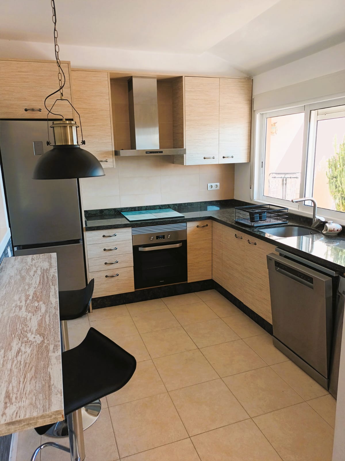 The top floor consists of a fully equipped modern kitchen that overlooks a large terrace with good views. The kitchen has all the appliances: an electric hob and oven, dishwasher, washing machine, fridge, freezer, and a breakfast bar. Store cupboard with electric water heater.
