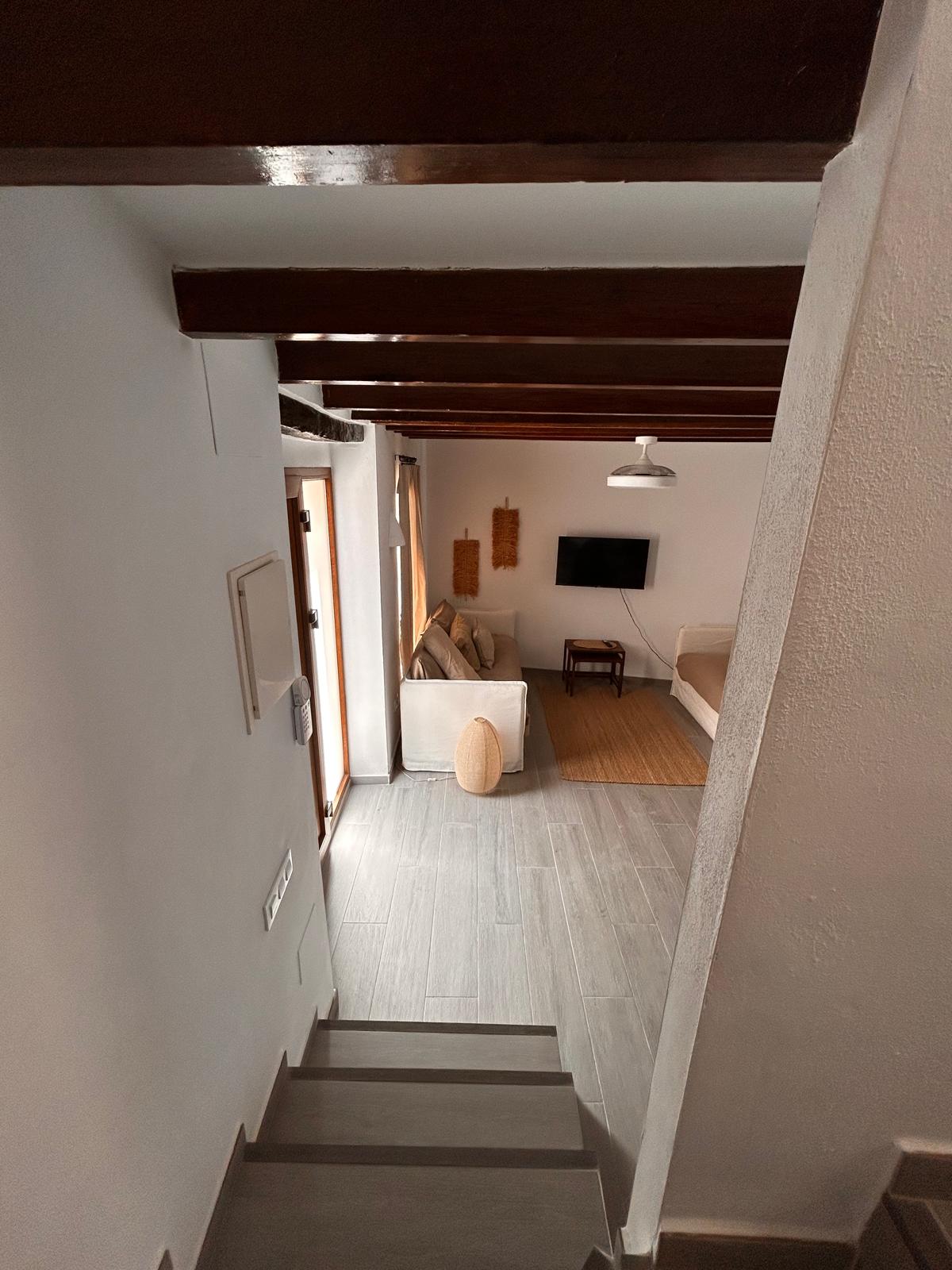 On the main floor, you’ll find a cozy open-plan living and dining area, a fully equipped kitchen, the bathroom, and a smaller terrace. Upstairs are two bedrooms and access to the larger sunny terrace.