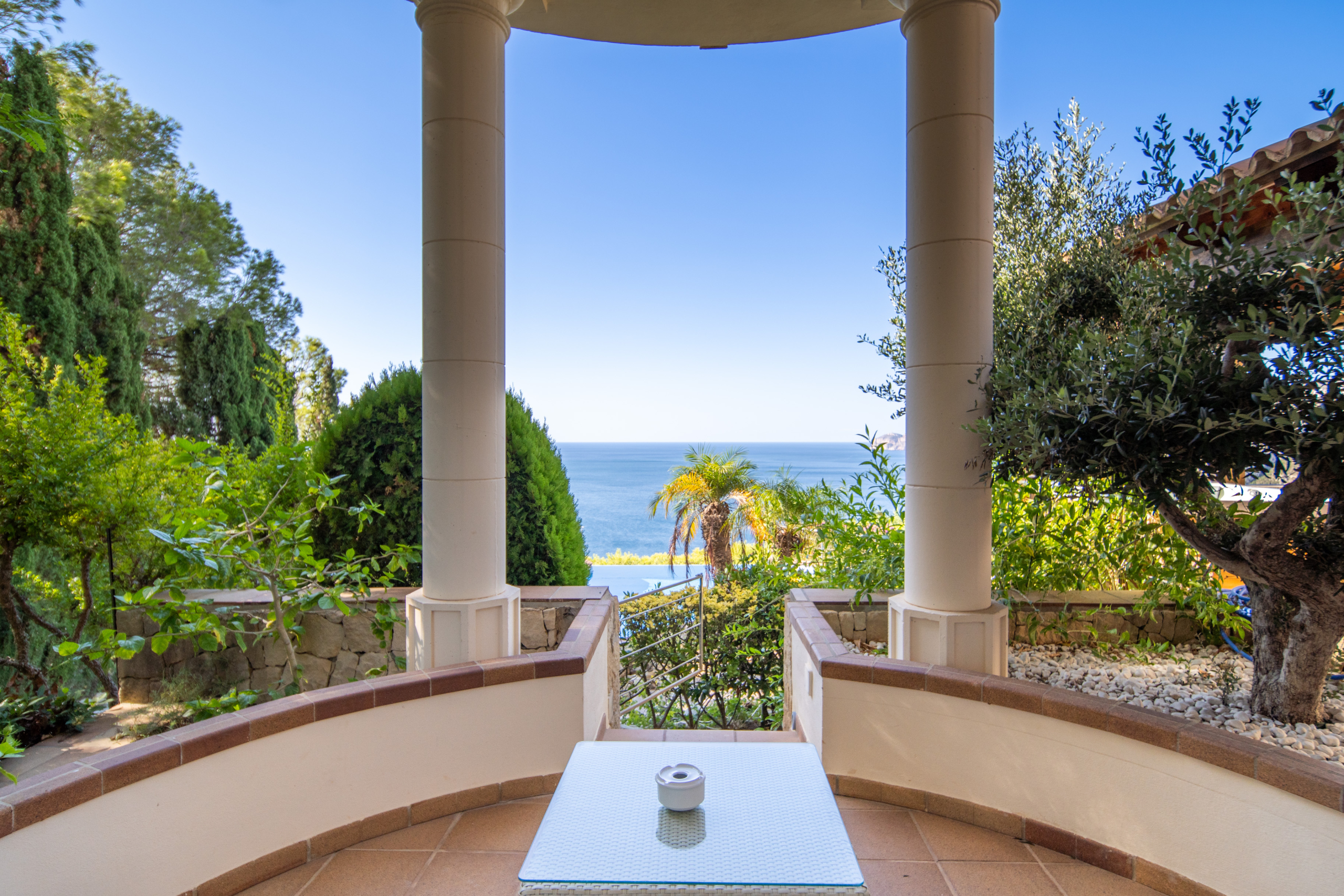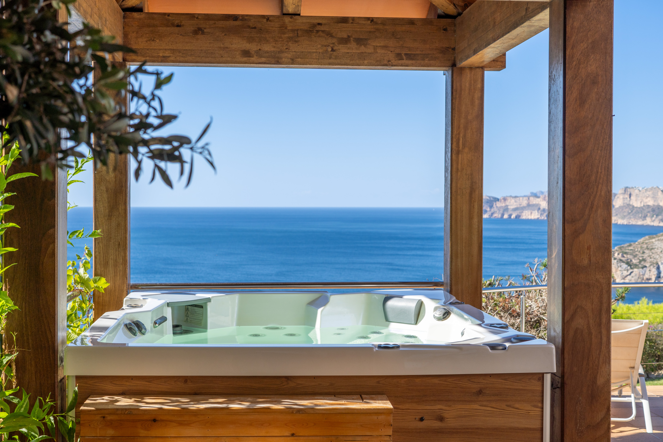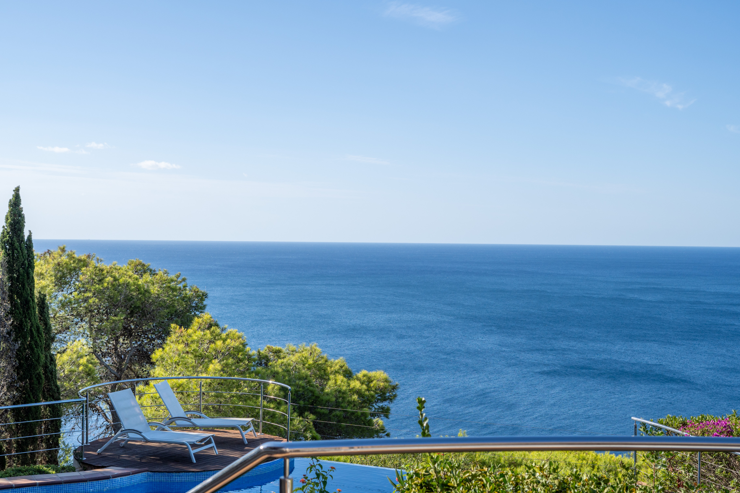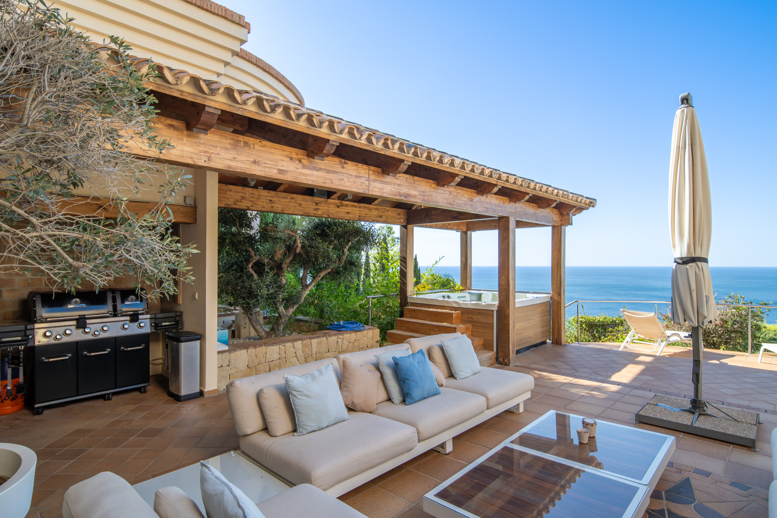 Outside, the property comes alive with an exceptional entertaining space. A covered veranda, outdoor dining and lounge areas, a barbecue, hot tub, manicured garden with mature trees, and an infinity pool overlooking the horizon make this the ultimate Mediterranean setting.