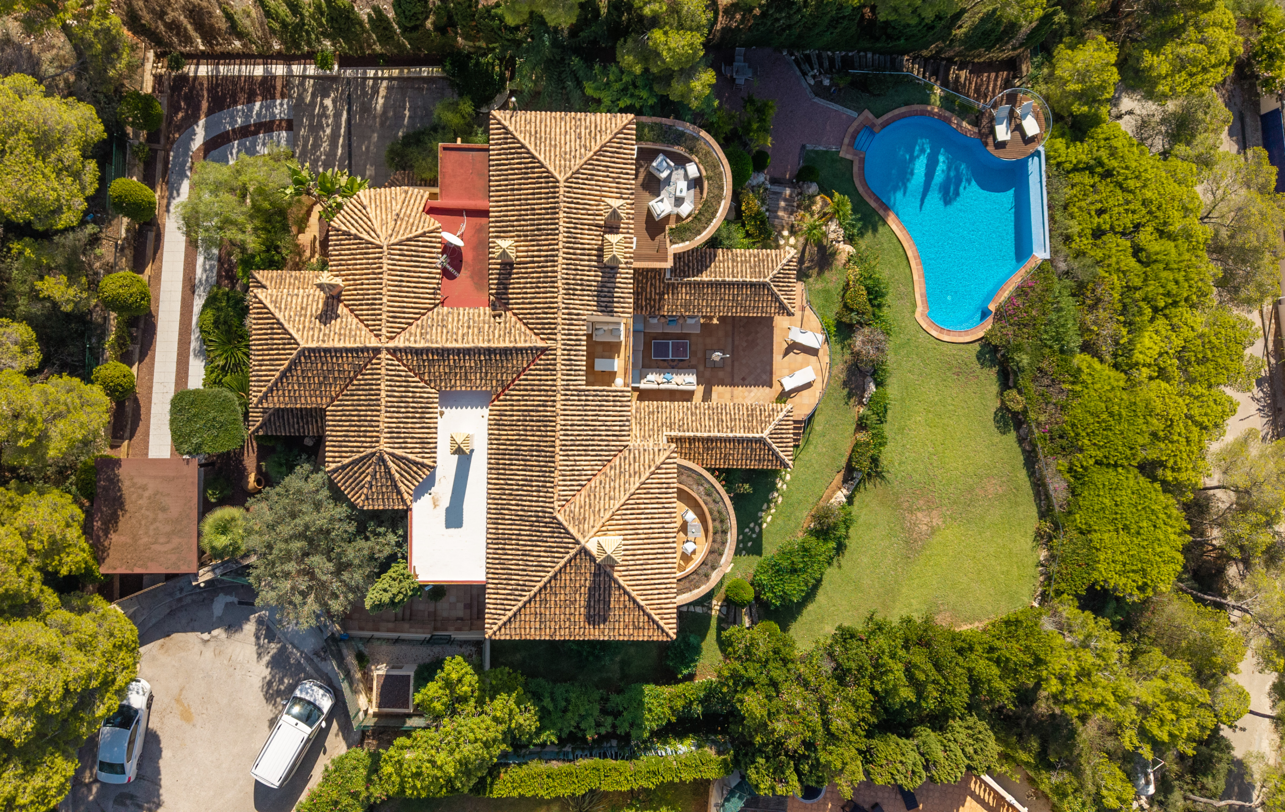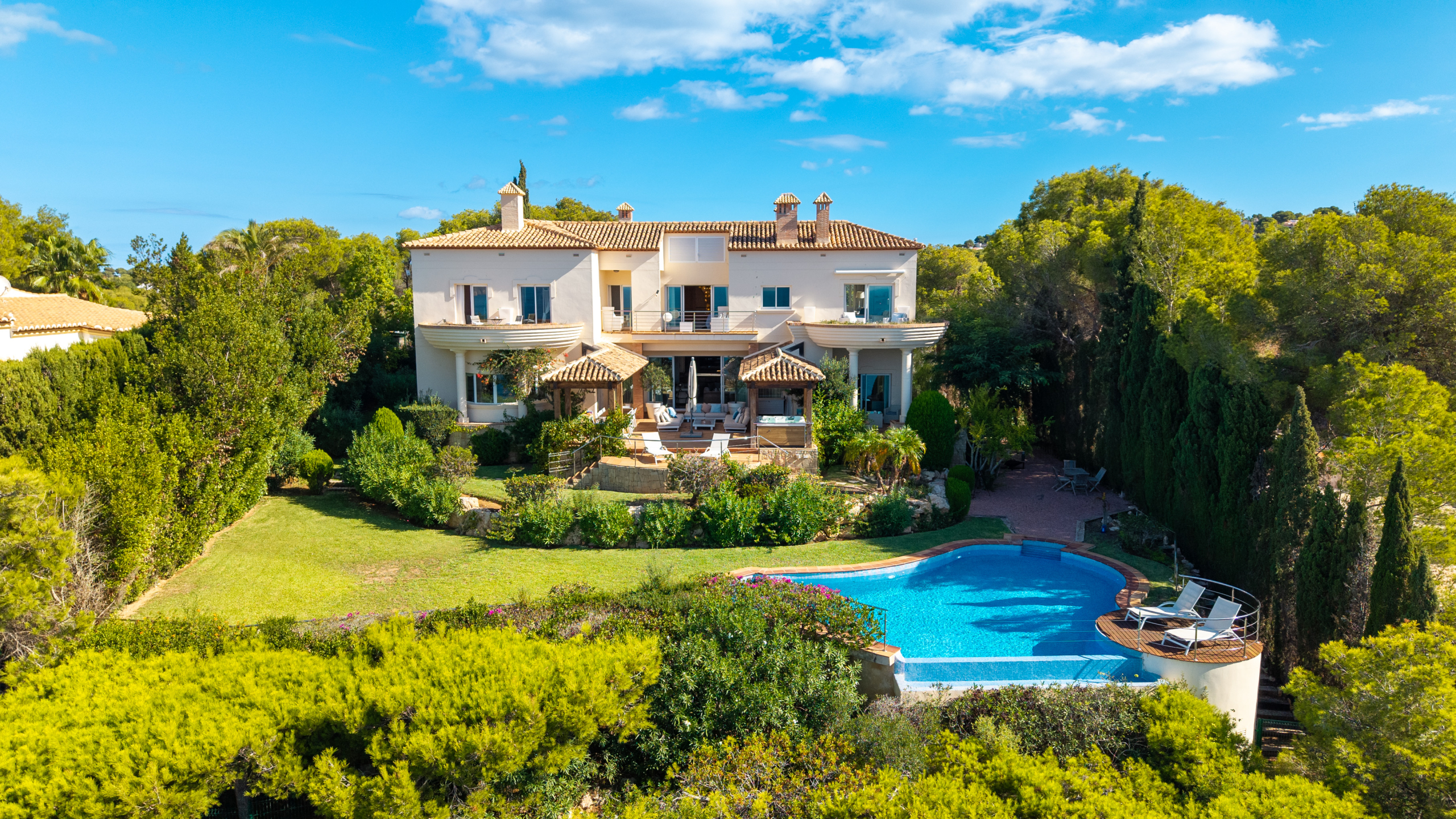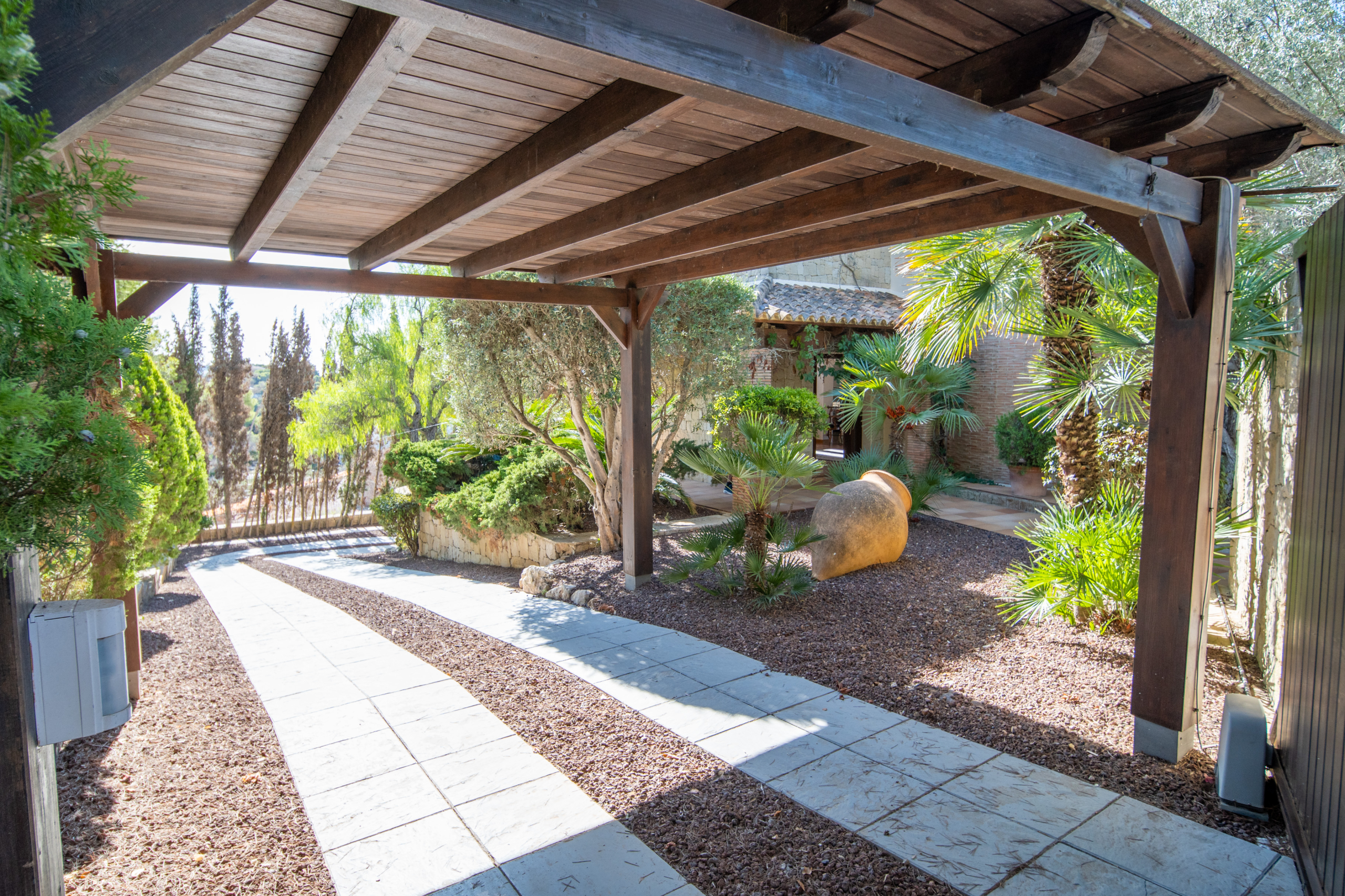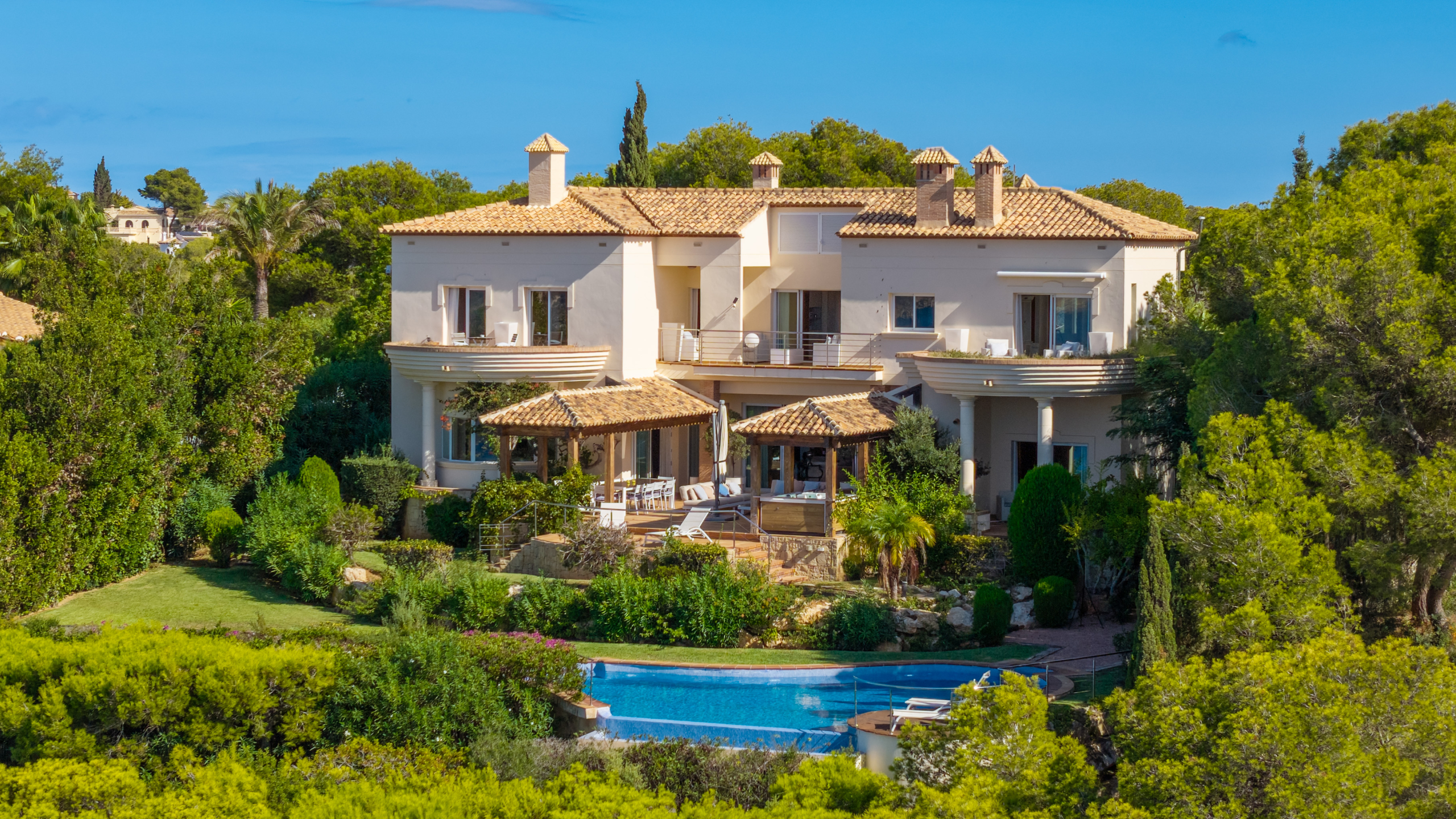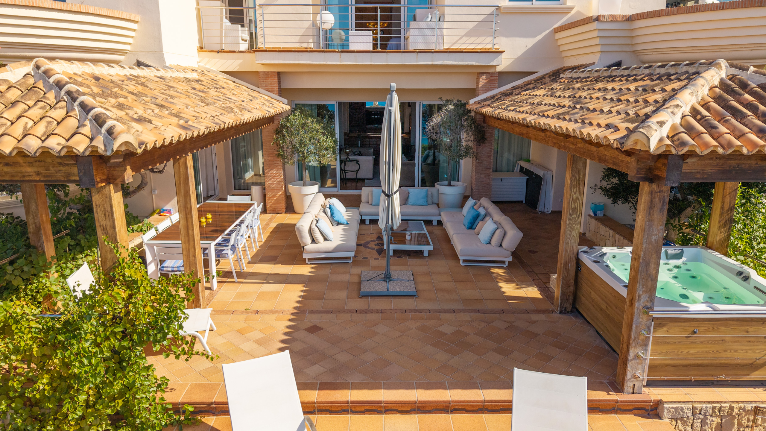 Outside, the property comes alive with an exceptional entertaining space. A covered veranda, outdoor dining and lounge areas, a barbecue, hot tub, manicured garden with mature trees, and an infinity pool overlooking the horizon make this the ultimate Mediterranean setting.