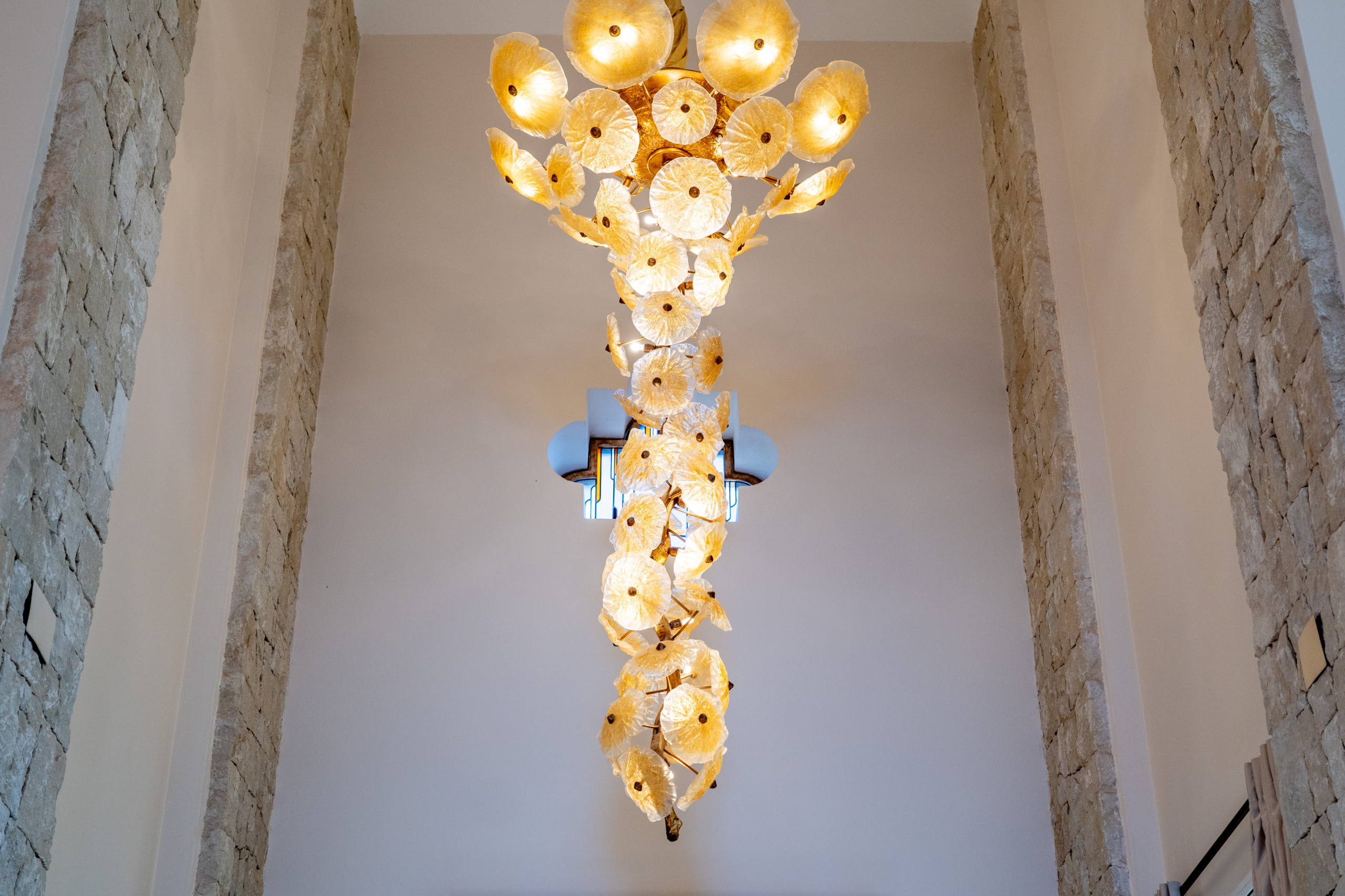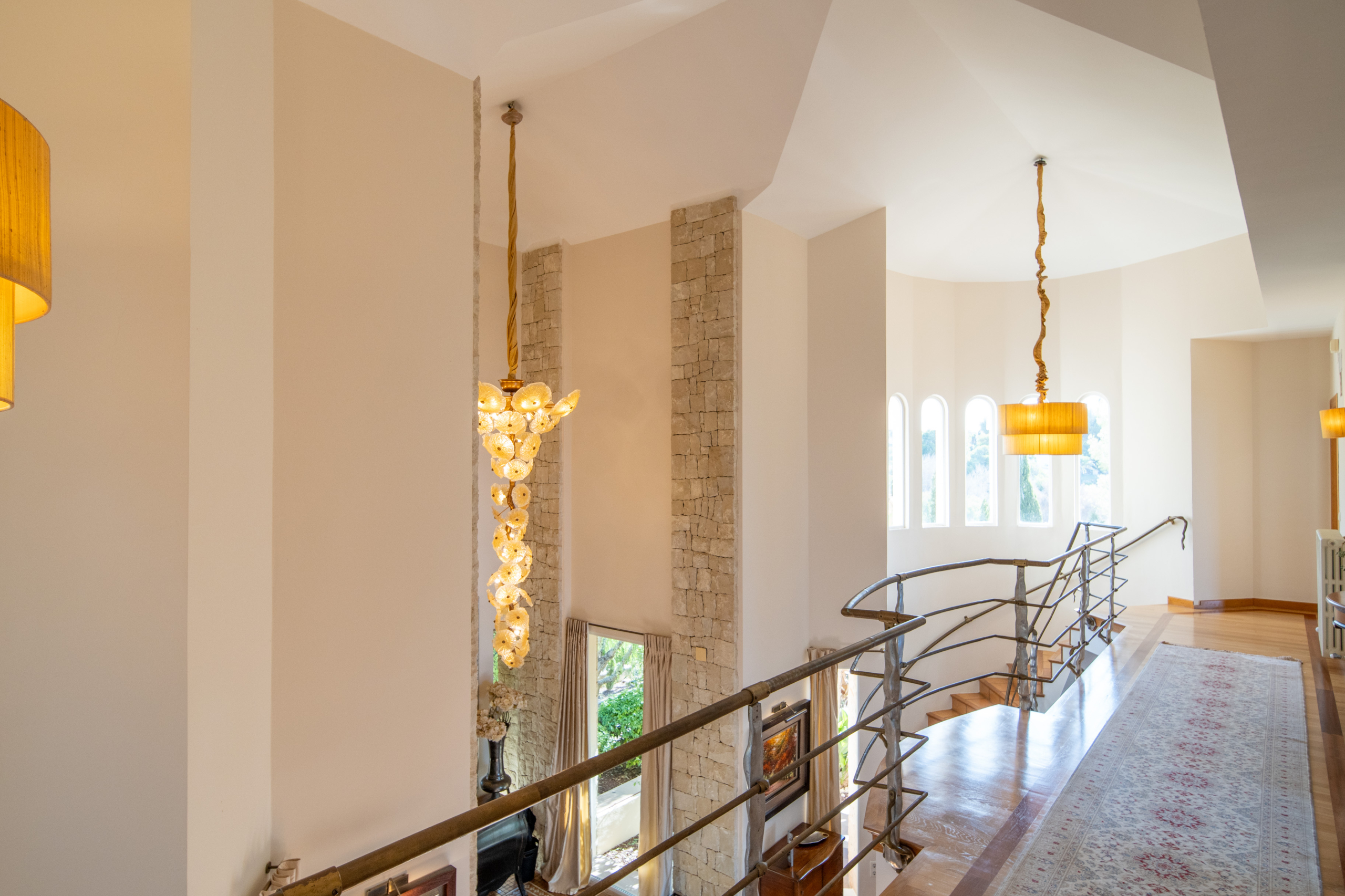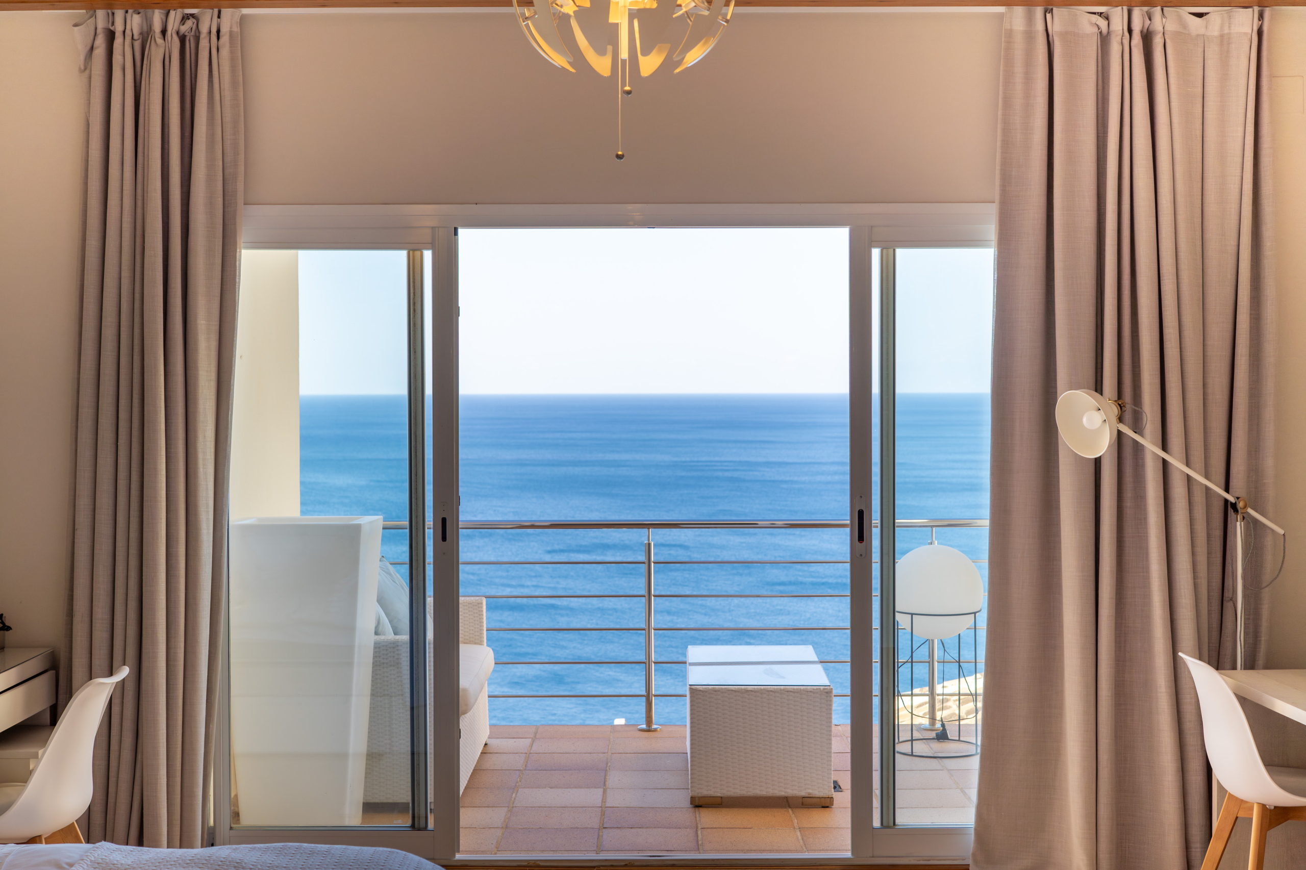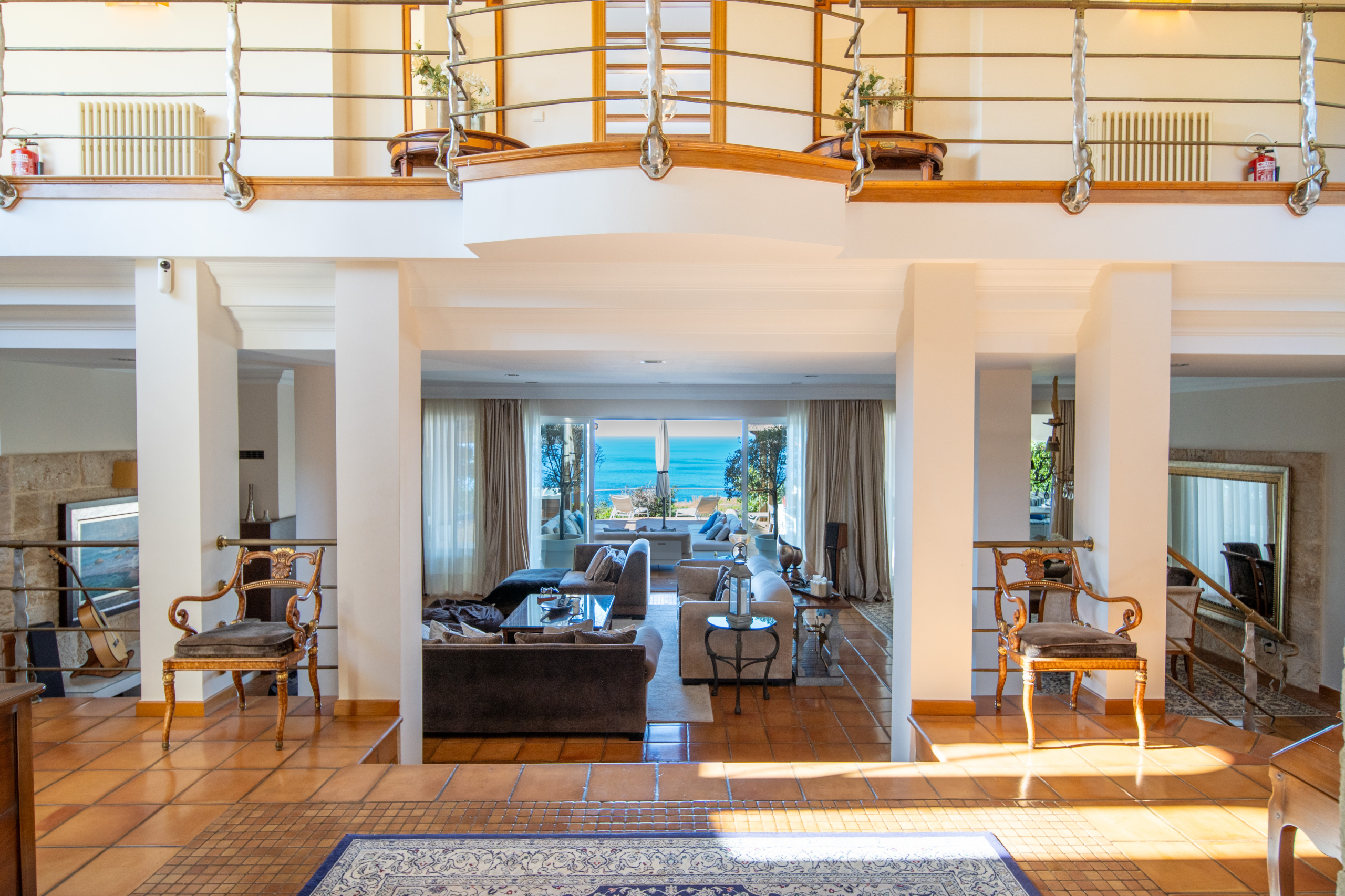 The mezzanine hallway with feature lighting, leads to further bedrooms. In the middle of the landing, a bedroom with its own balcony and sea view provides a serene escape. Further down the hallway you can find a separate lounge area that connects to an ensuite double bedroom with terrace access. Off the lounge is also a further shower room and another generous double with office space and private sea-view balcony offering both practicality and luxury.