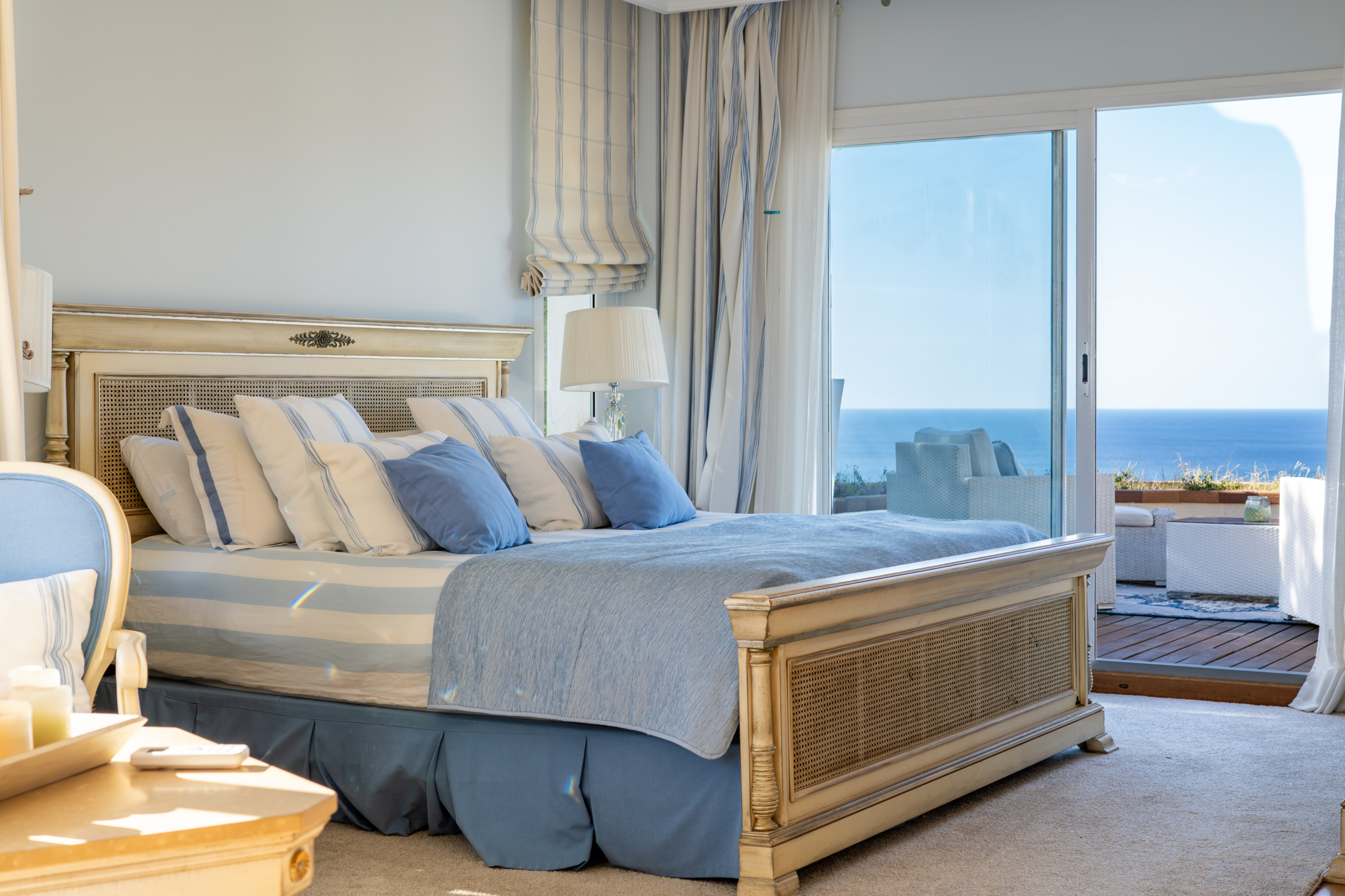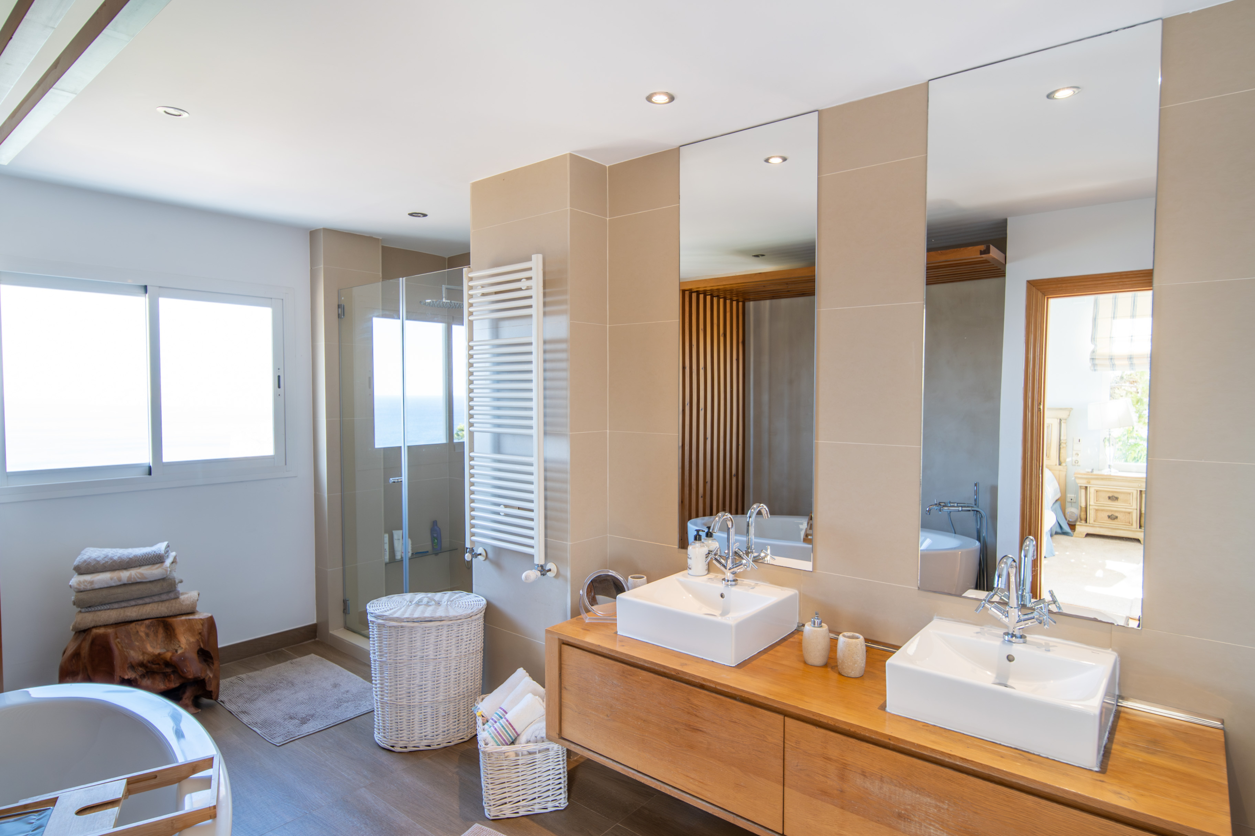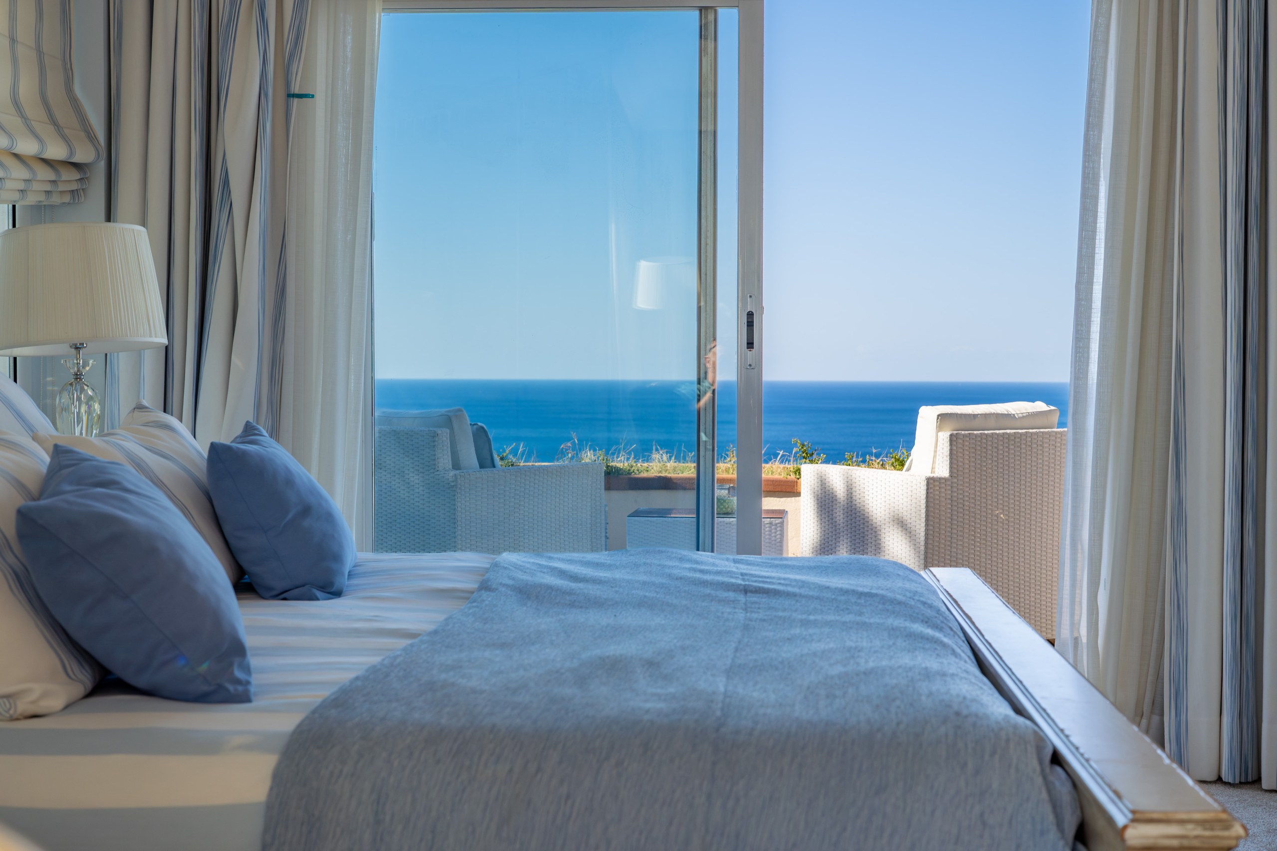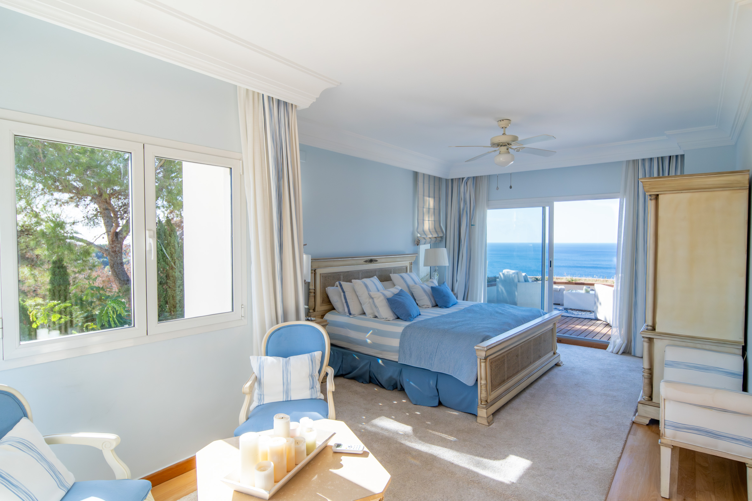 The master suite situated on the top floor, offers complete privacy and a breathtaking outlook over the sea. This vast space features a private sitting area, a decked terrace, and a sumptuous ensuite with his-and-hers sinks, an oval corner bath, and a double shower with sea views. A spacious dressing room with extensive wardrobes completes this room.