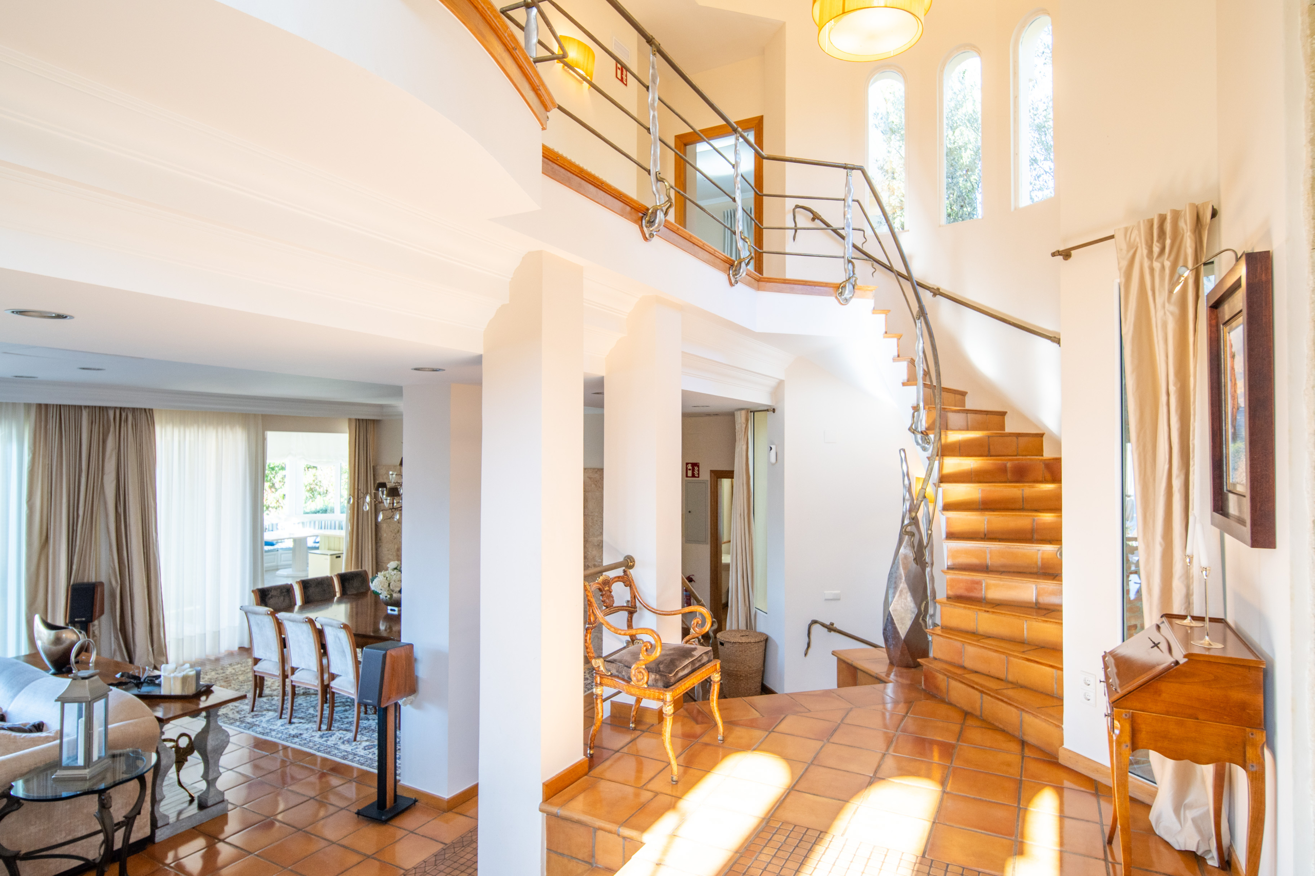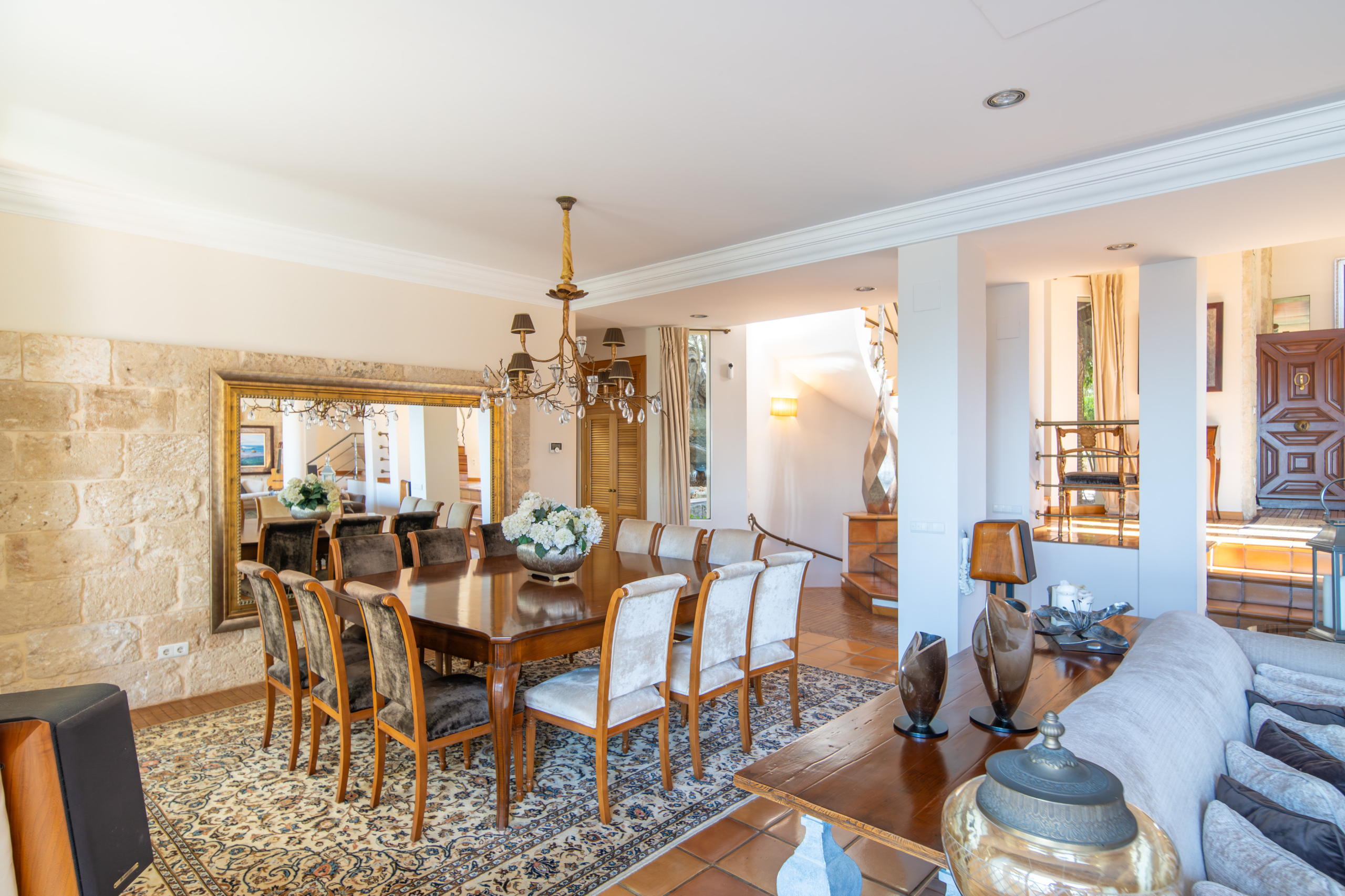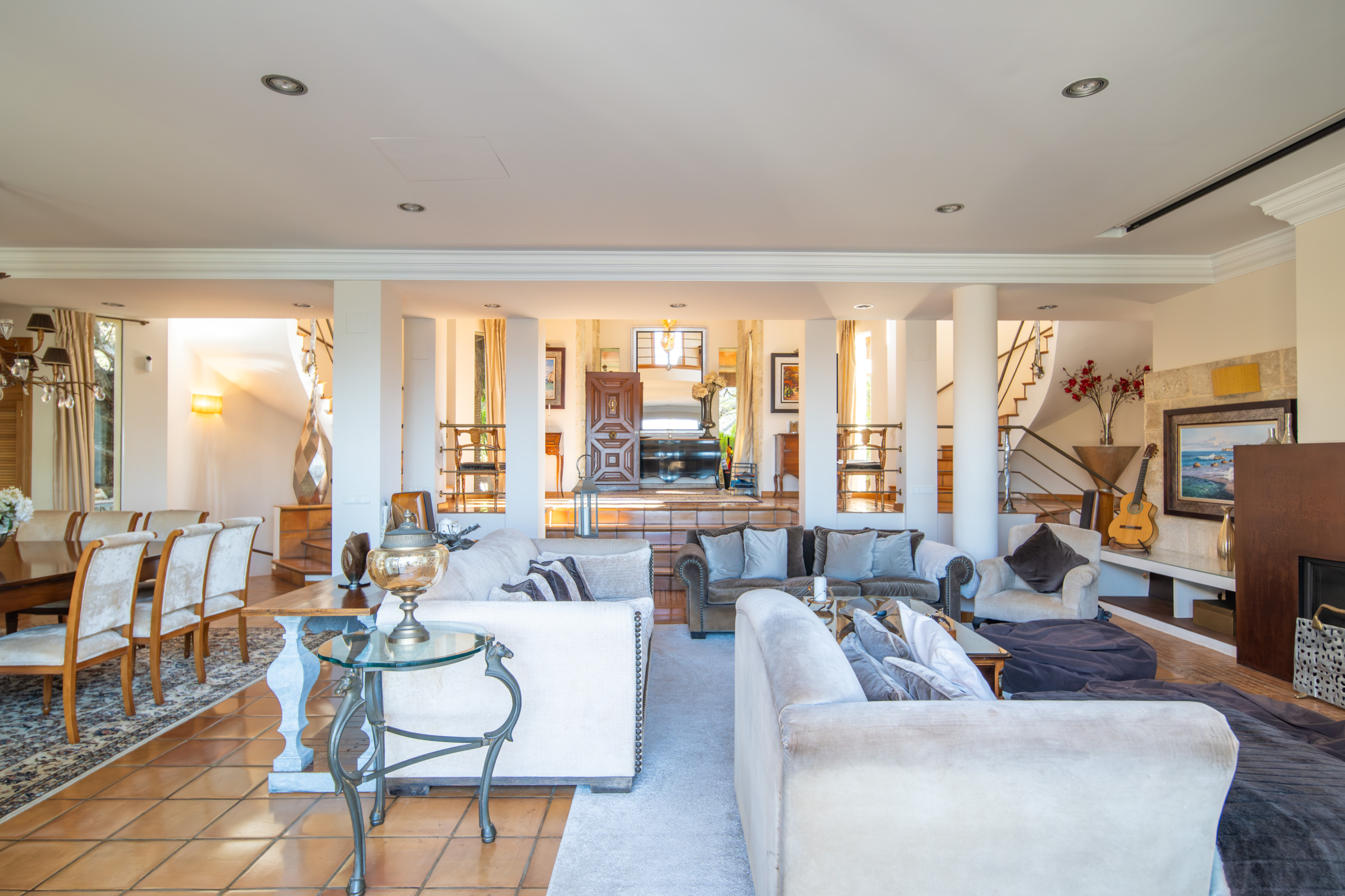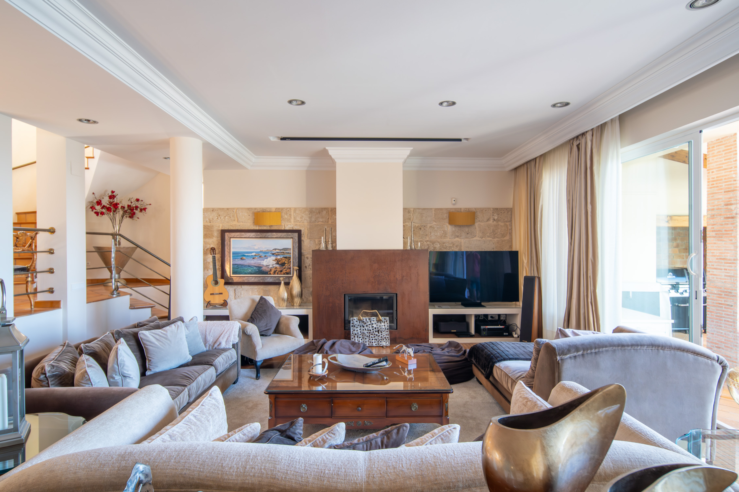 A sweeping staircase from both sides frames the living room to a sunken lounge with multiple seating areas, a flat-screen TV, log burner, and a vast dining space. The kitchen is fully equipped with modern appliances, abundant storage, and a breakfast bar, accompanied by a cosy corner dining area with sea views.
